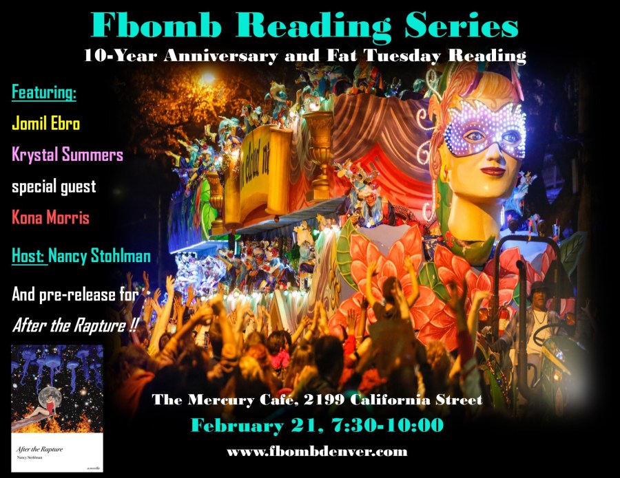 It’s the 10-year anniversary of the Fbomb, the first and longest running flash fiction reading series in the country, and we are thrilled to celebrate at our original home with a very special Fat Tuesday reading and release at The Mercury Cafe with featured readers Jomil Ebro, Krystal Summers, special guest Kona Morris, PLUS a one-night-only opportunity to buy signed copies of After the Rapture before the official release date!